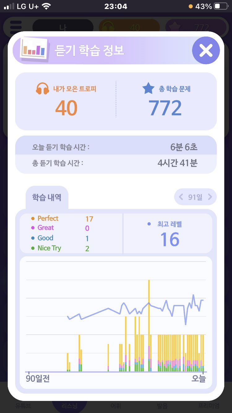 리스닝은 현재 최고 레벨 16에 도달했고.. 아직 한 번에 듣지 못하는 문장들이 정말 많다..