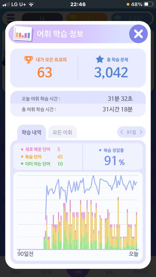 그래서인지.. 기간은 더 길지만, 학습한 어휘는 지난 달에 비해 줄어들었다.